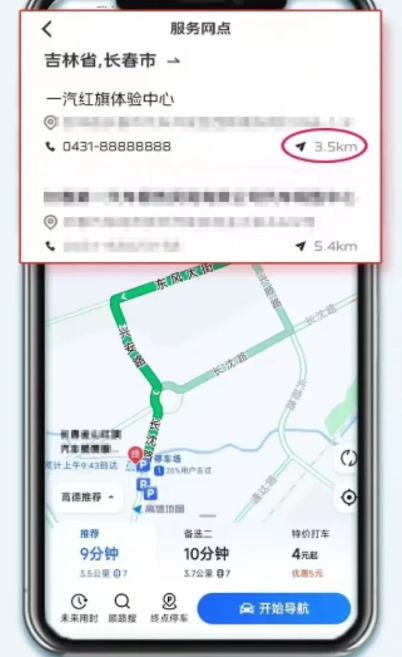 1.红旗智联界面底部显示【距离最近服务网点】,点击【更多】查看附近网点距离、地址、联系方式