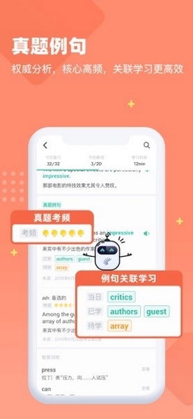 【真题实例】拥有覆盖近四十年考研英语试题的数据库,以及近十一年四六级试题数据库。能精准检索出单词释义在考题里的出现频次,让高频词汇轻松被掌握。