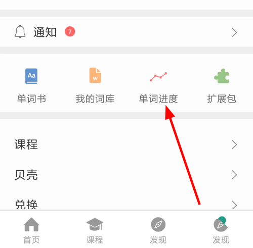 2. 当进入“我的页面”后,点击“单词进度”选项。