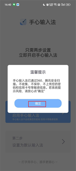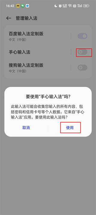 2. 进入输入法管理页面,点击开启手心输入法的使用。