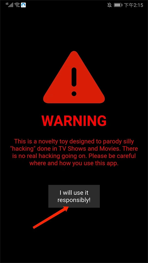 1、打开geektyper后,你会马上进入一个带有神秘感的黑色命令行界面,点击下方的【I will use responsibly】提示就能进入主操作界面。