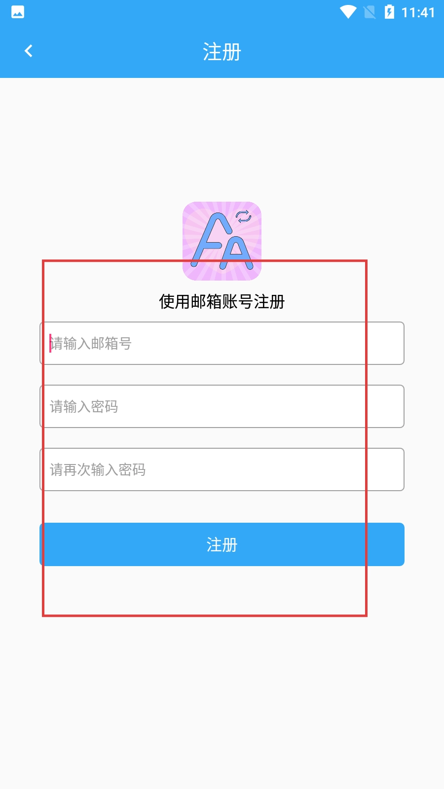 4、进入注册账号页面后,按顺序填写邮箱号、设置密码并再次确认密码,随后点击【注册】按钮,就能完成账号注册流程。