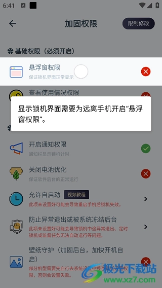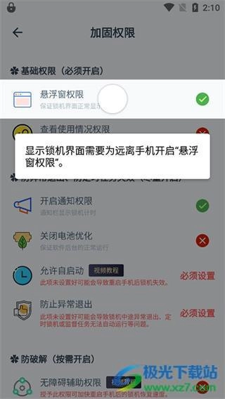 1、首先打开手机里的“远离手机”应用,进入首页后需要先授予部分权限才能继续使用,此时点击右上角的“加固权限”选项即可。