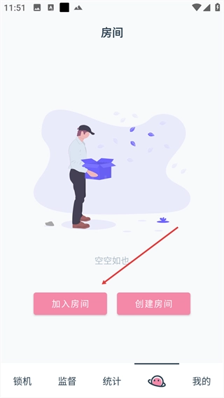 1、在锁机页面,点击底部导航栏的【房间】选项。