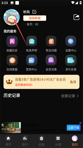 1、在椰子影视首页找到“我的”选项并点击,即可进入个人中心页面。