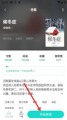 2、点击进入你喜欢的书籍,像【候冬症】,在看完书籍的基本信息之后,别再迟疑,马上点击【开始阅读】,开启你的阅读之旅吧。