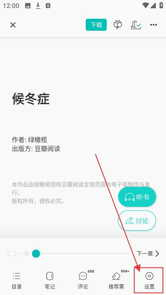 3、在阅读时,如果想要调整阅读设置,点击页面上的【设置】按钮,即可进入设置界面。