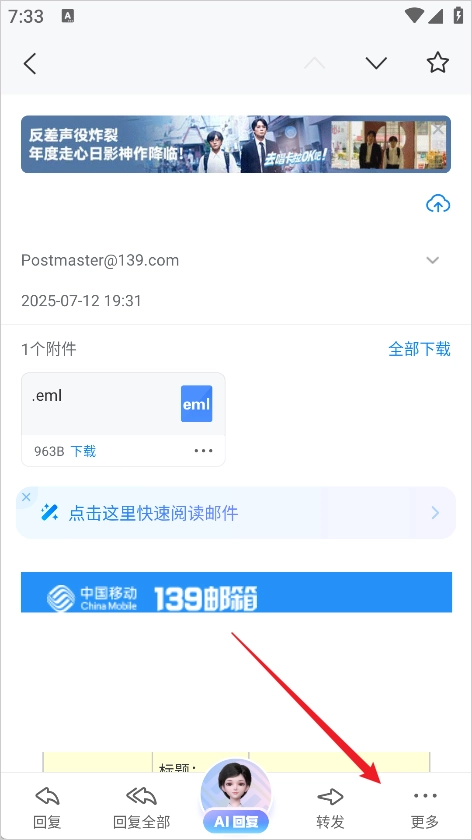 2、进入邮件内后,点击右下角的更多。