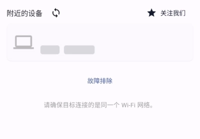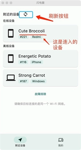 首先将两个设备连接起来,当闪电藤和localsend这两个应用都启动,并且处于同一局域网环境时,它们会自动完成互相发现;若未能成功发现,点击刷新按钮重新尝试即可。
