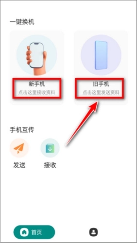 2、需要发送资料的一方点击右侧的“旧手机”,需要接收资料的一方点击左侧的“新手机”