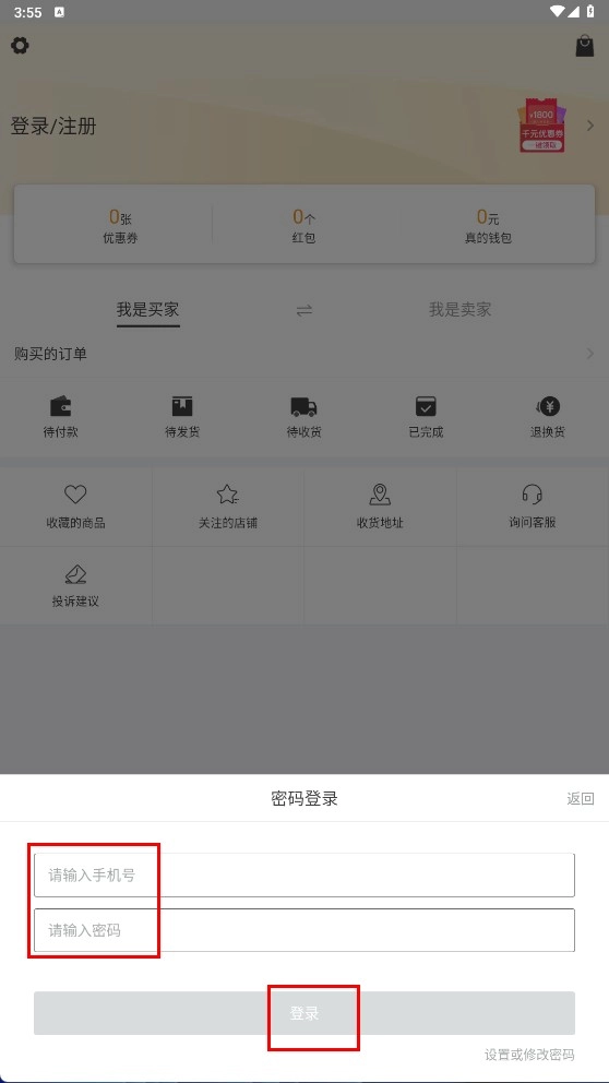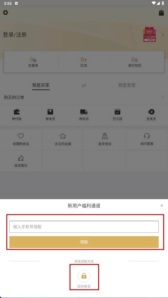 在新用户福利通道,您可以输入手机号领取福利,也可以选择【密码登录】选项,进入密码登录界面。