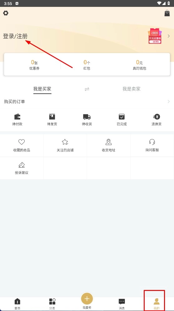 点击页面底部的【我的】选项,进入个人中心页面后,找到并点击【登录/注册】按钮,即可进入账号登录的操作流程。