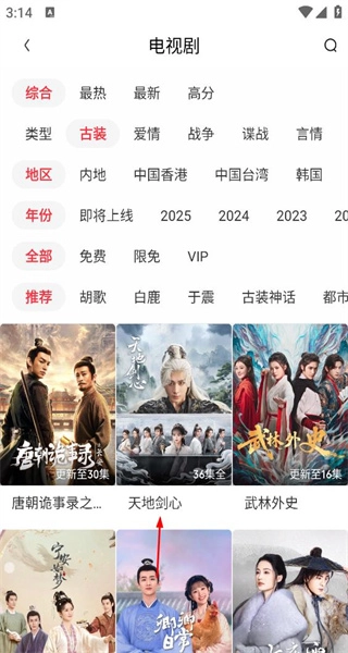 进入电视剧专区,挑选古装类别,页面呈现《天地剑心》等古装剧集,点击相应剧集即可查看详细信息。