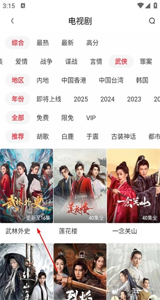 最后切换到武侠类型,页面上有《武林外史》《莲花楼》《一念关山》等武侠剧,大家可以从中挑选自己感兴趣的武侠剧观看。