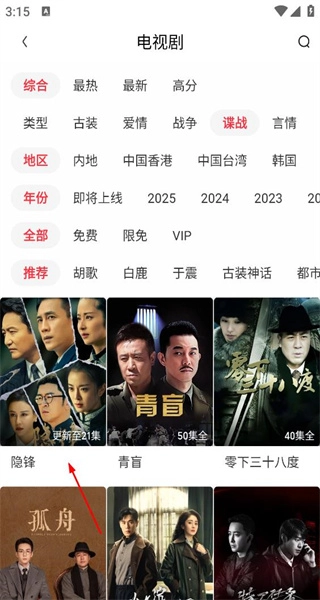切换到谍战类型后,页面会呈现《隐锋》《青盲》《零下三十八度》等谍战剧,便于用户浏览谍战题材的作品。