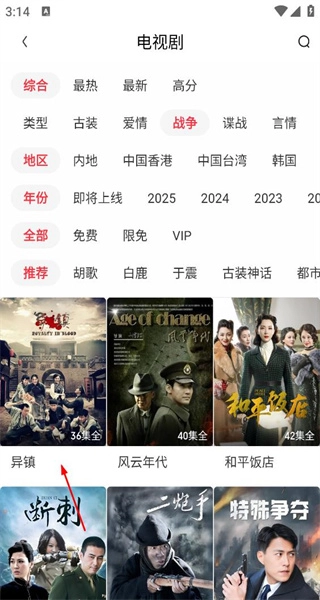 切换至战争题材分类后,页面会展示《异镇》《风云年代》《和平饭店》等战争剧作品,您可以依据个人喜好挑选剧集进行观看。