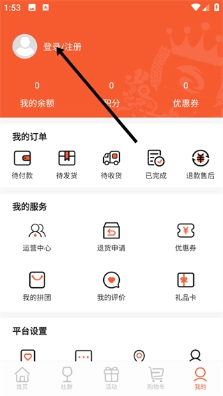 进入“我的”页面后,找到并点击【登录/注册】按钮,即可跳转至登录注册界面。