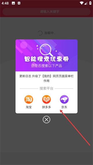 你可以从【淘宝】【拼多多】【京东】这几个搜索平台里任选一个,进行优惠券的智能搜索;要是不想操作,也能点击关闭按钮把这个弹窗关掉。