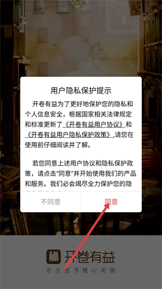 在使用【开卷有益】之前,请您务必阅读并同意《开卷有益用户协议》以及《开卷有益用户隐私保护政策》,只有点击“同意”按钮后,才能继续进行后续操作。