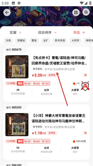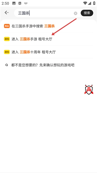 在搜索结果里找到并点击【进入三国杀租号大厅】这个选项,就能进入到租号列表页面了。