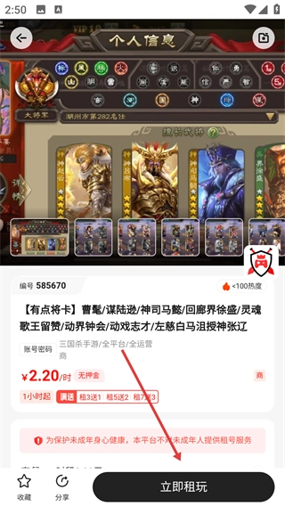 在租号列表页面挑选你喜欢的账号(比如编号585670的账号),然后点击进入该账号的详情页面。