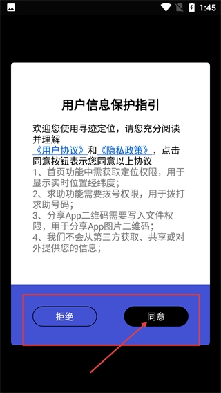 打开软件后,要阅读《用户信息保护指引》,点击“同意”按钮来确认协议,该协议包含定位、拨号等权限的使用说明。