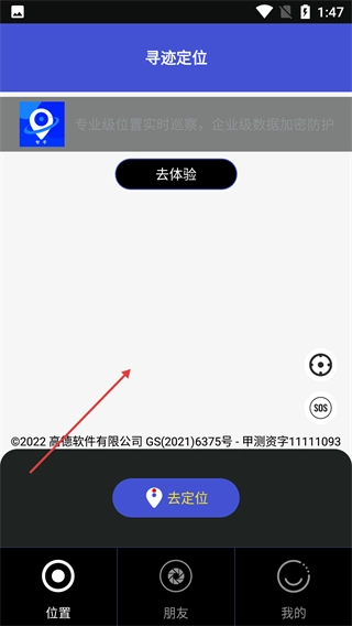 完成登录进入主界面后,点击【去体验】或【去定位】即可启用位置功能,该软件支持专业级实时位置巡察服务。