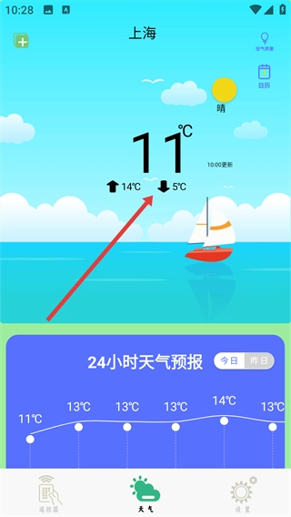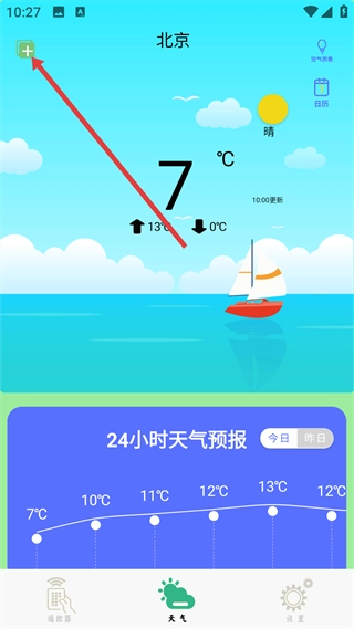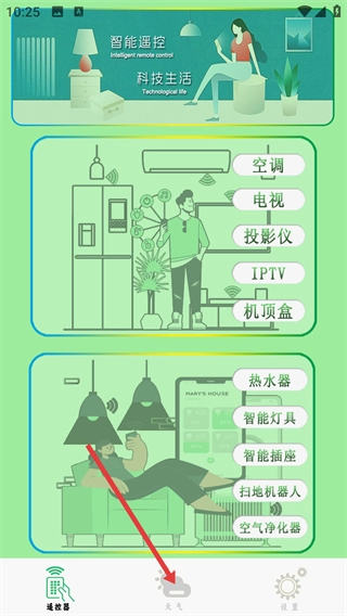 打开智能遥控软件后,点击底部的【天气】选项,即可进入天气功能页面。