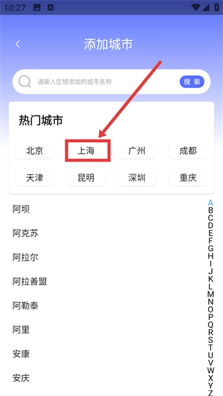 在添加城市的界面中,挑选热门城市里的【上海】,即可完成城市添加的操作。