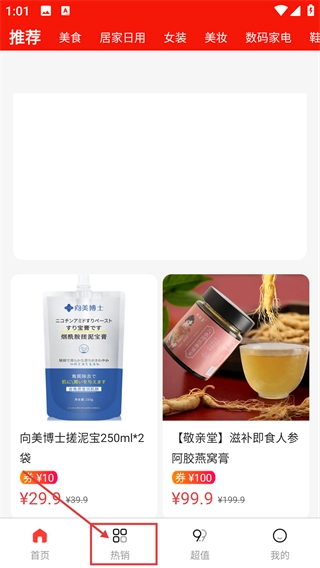 进入应用主界面后,顶部设有【美食】-【居家日用】等分类标签,底部点击【热销】即可进入热销商品列表页面。