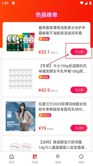 在【热销】页面能够查看【热销榜单】里的商品,每个商品旁边都设有【马上抢】按钮,点击该按钮就能进入对应的商品购买流程。