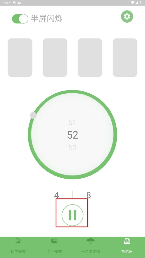 在节拍器界面,点击【暂停播放按钮】即可暂停节拍器的运行。