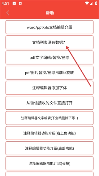 在帮助页面里选择【文档列表没有数据?】这个选项,就能进入查看视频的页面。