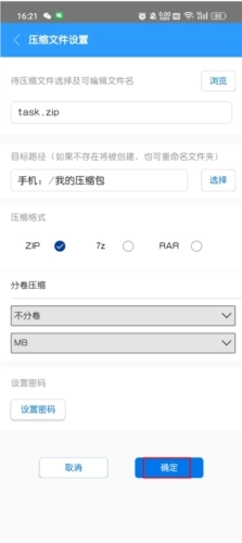 5、最后进入压缩文件设置界面,选择好压缩路径、格式,以及是否设置密码,点击确定即可完成操作。