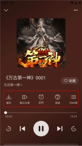 3、开始播放后,您可以自行调节语速,也可以设定听书时长、选择章节或缓存小说等。