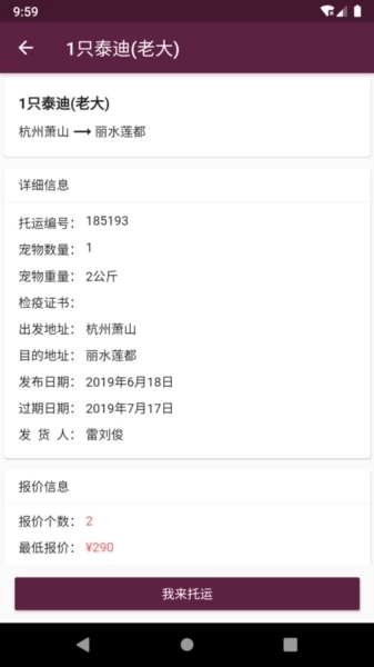 1.可免费发布宠物托运需求,之后等待宠物托运公司给出报价并通知您。