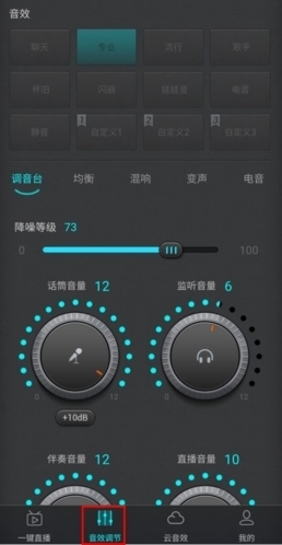 1、在音效调节页面中有很多的音效,包含聊天、专业、流行、歌手、怀旧、闪避、娃娃音、电音、静音,还提供有三个自定义音效,用户可自行DY自己喜欢的个性音效。每种音效可调节调音台、均衡、混响、变声、电音相关数据。每一步调节指令实时发送给声卡。