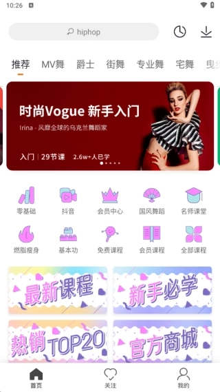 3、打开软件进入首页后,能看到推荐、MV舞、爵士、街舞、专业舞等多个分类板块,不同学习阶段的用户都能在这里找到适合自己的内容进行观看学习。