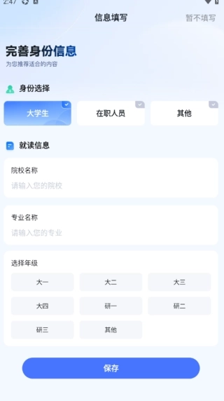 1、进入软件后,系统会提示您补充完整身份信息,以便系统能更精准地为您匹配对应的题库。