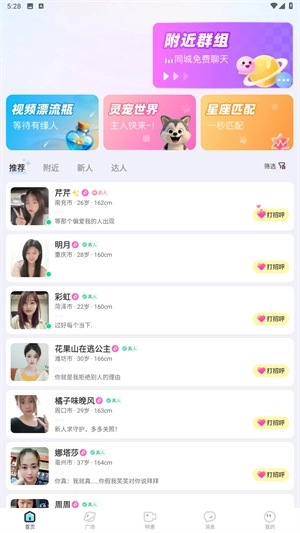 《友趣》是一款非常深受大量用户喜爱且好用的社交聊天软件,软件系统准备了许多精美好听的声音特效,用户只需要几步简单的操作就能发出充满特色的声音,帮助用户快速的匹配到心仪的那个ta,同时这里也拥有非常多充满趣味性的话题和游戏等着用户来体验,软件也拥有非常多不同性格和兴趣爱好的朋友等着你来认识噢。