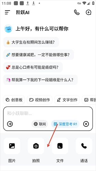 1、用户登录跃问后,可在对话页面点击右下角的加号按钮