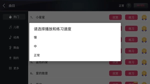 3、点击右上角的“选择音乐”选项,我们就能挑选不同类型的钢琴曲来进行练习。