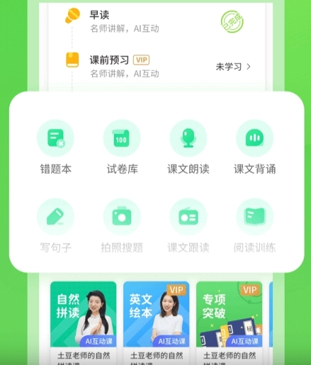 课本点读、口语练习、作业辅导、绘本课程、考试测评、早读课程、课前预习、课后巩固、阅读训练、语法训练、听力训练、每日英语、教师作业、易错题、精选收藏、听力练习、欧美课程、学习工具、趣味配音、配音测评、词典工具!