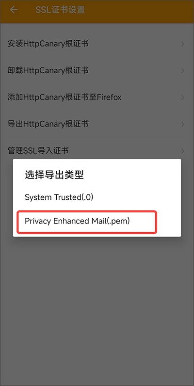 导出类型选择下面这个(.pem)【我这里是未root环境,所以选.pem;要是设备已经root且有更高要求的话,可以选.0】