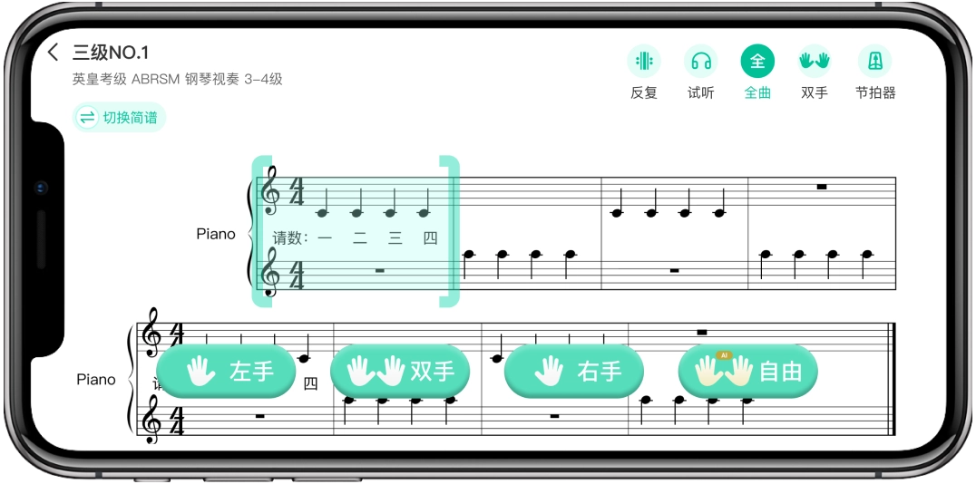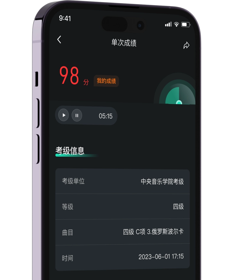 一键开启全曲测评功能,不仅能语音播放点评内容,还可随时查看得分,让每一次演奏的表现都能被精准量化呈现。
