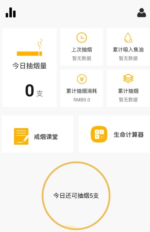 用户完成这些基本信息的填写后,便会进入主页面,在该页面能够查看今日抽烟数量、累计吸入的焦油量以及购买香烟所花费的金额等相关信息。