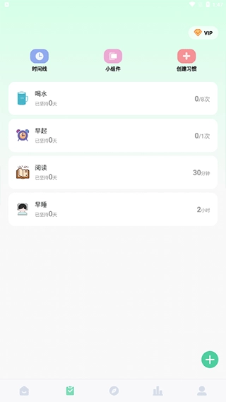 在第二个页面里,用户既能记录自己专注做事的过程,也能自主创建各类习惯来督促自己持续坚持。