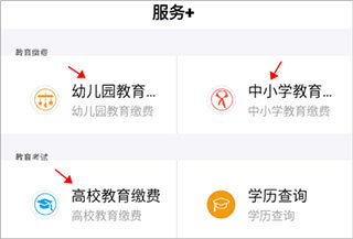 打开软件后,进入“服务+”界面,挑选缴费类型,像幼儿园、中小学、高校教育这类都可以。