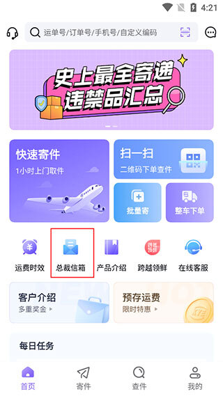 先从本站找到跨越速运的安装包并完成安装,接着打开该软件进入主界面,随后点击页面上的【总裁信箱】选项。