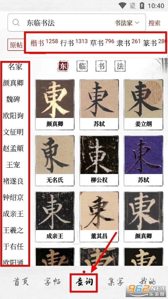 后,点击【查询】功能,就能查找自己喜爱的字体和书法家。